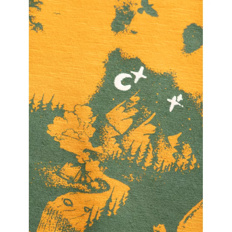 Rundhalsausschnitt mit schmalem Piping, kurze Ärmel mit Piping, Grafik im Brustbereich, Zick-Zack Stickerei an der Schulternaht, Flaglabel, reguläre Passform