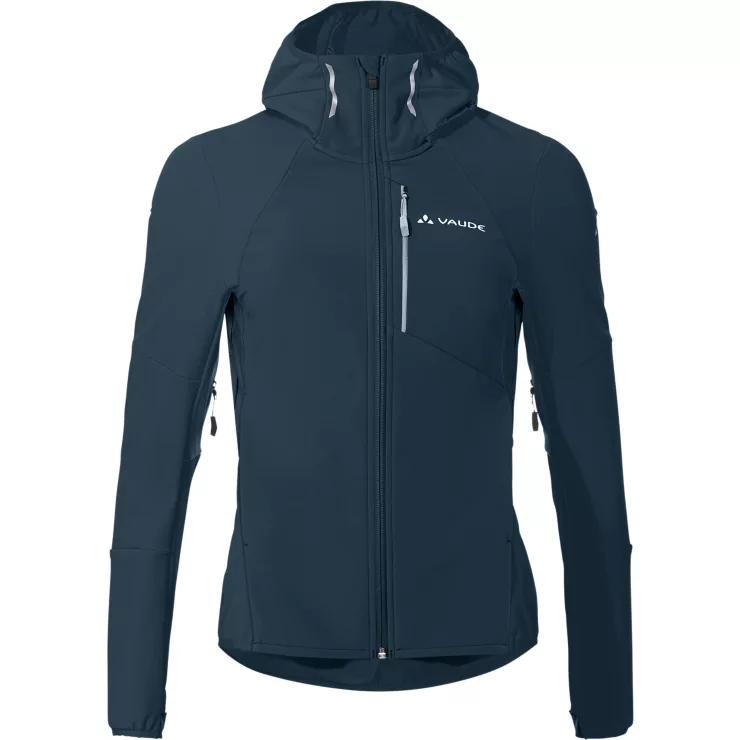 Die schmal geschnittene Softshell-Kapuzenjacke für Damen wurde speziell für sportliche Skitouren konstruiert.